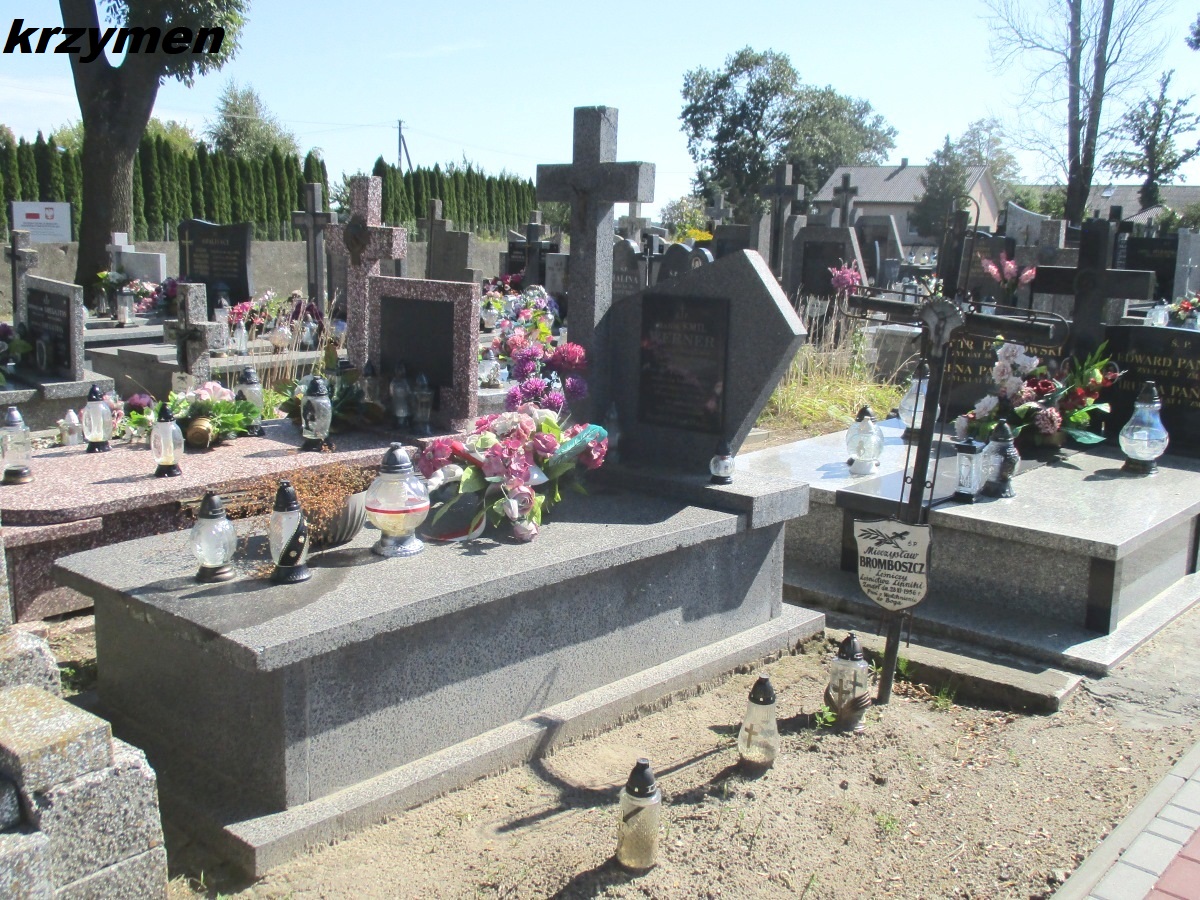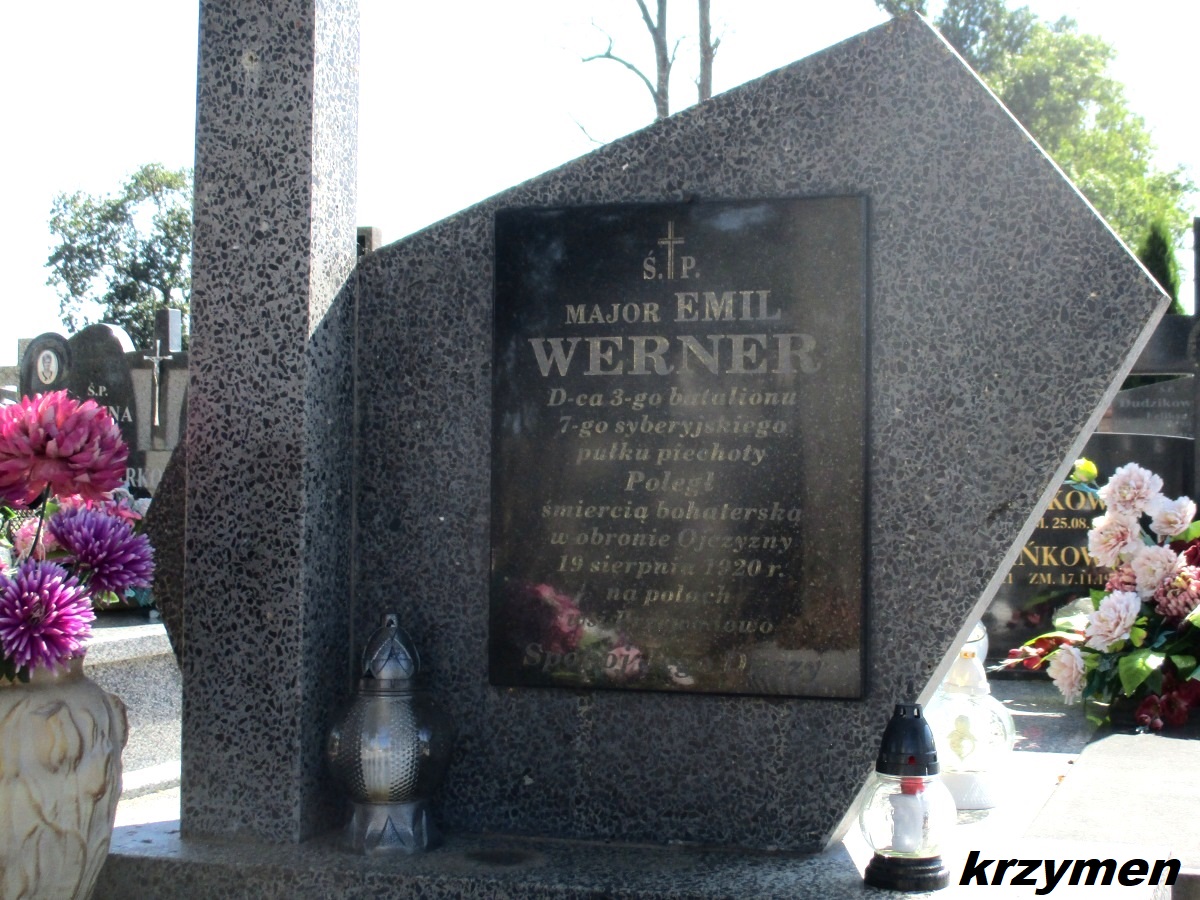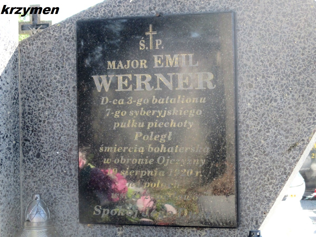Grób majora Emila Wernera znajduje się po lewej stronie alei głównej. Emil Werner, ur. (13)25.07.1889 r. w Żytomierzu, został powołany do armii rosyjskiej w grudniu 1914 r. Ukończył Aleksandrowską Szkołę Wojskową i w lipcu 1915 r. został mianowany chorążym (praporszczyk). Trzykrotnie ranny w walkach frontowych, odznaczony orderami św. Anny 3 i 4 kl. oraz św. Stanisława 3 kl. z mieczami i kokardą. W 1916 awansował do stopnia sztabs-kapitana. W kwietniu 1917 r. przeniesiony do Dywizji Strzelców Polskich (2 p. strzelców). W I Korpusie Polskim pełnił funkcje komendanta Rohaczewa i służył w I Legii Oficerskiej. Po rozbrojeniu I KP udał się na Syberię i wstąpił do 5 Dywizji Syberyjskiej. Wyróżnił się w walkach przeciwko bolszewikom. W sierpniu 1919 r. ciężko ranny. Po kapitulacji dywizji, uwięziony w obozie w Kramatorsku, skąd zbiegł. Z fałszywymi dokumentami przedarł się przez Rosję i przekroczył front. Od czerwca 1920 r. w Wojsku Polskim. Dowódca III batalionu 1 syberyjskiego pułku piechoty1) Brygady Syberyjskiej. Ranny w walkach, pozostał w szeregach. Poległ 19.08.1920 w ataku pod Czarnostowem. Pośmiertnie odznaczony Virtuti Militari, Krzyżem Walecznych i Krzyżem Niepodległości.