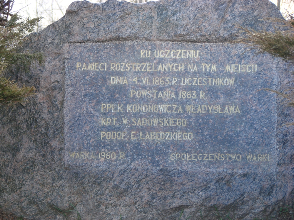 ”KU UCZCZENIU • PAMIĘCI ROZSTRZELANYCH NA TYM MIEJSCU • DNIA 4.VI.1863 R. UCZESTNIKÓW • POWSTANIA 1863 R. • PPŁK. KONOWICZA WŁADYSŁAWA • KPT. E. SADOWSKIEGO • PODOF. F. ŁABĘDZKIEGO •• WARKA 1960 R. SPOŁECZEŃSTWO WARKI”.