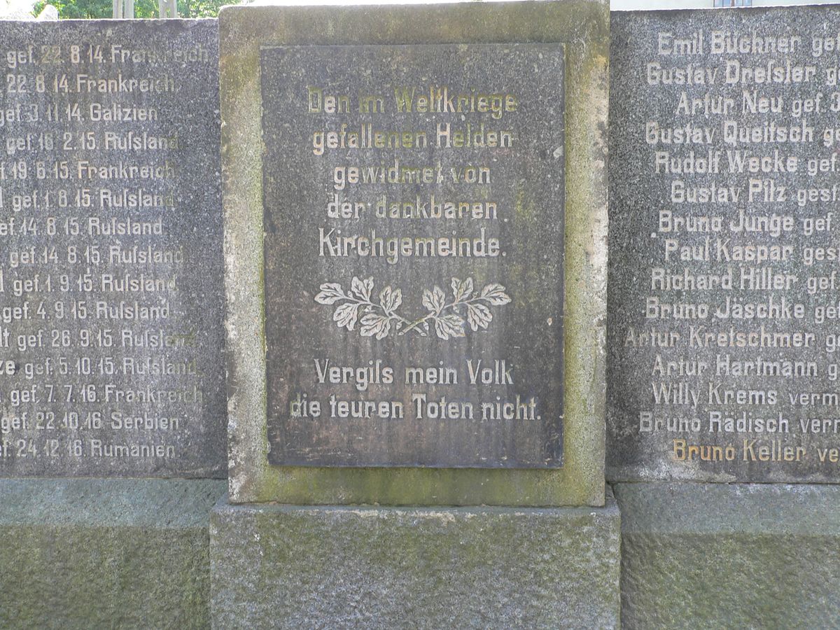 "Den im Weltkriege • gefallenen Helden • gewidmet von • der dankbaren. • Kirchgemeinde. •• Vergils mein Volk • die teuren Toten nicht."
