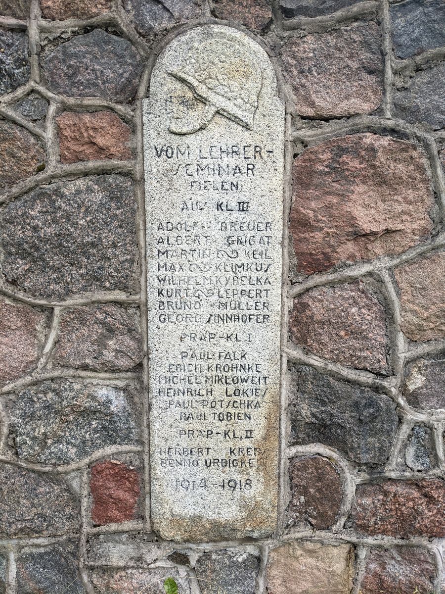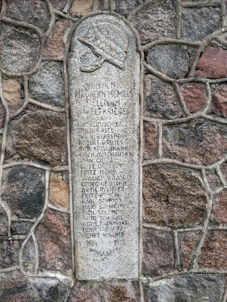 Die Zahlstelle Memel des Zentral verbande der Zimmerer Betrauert den Verlust der Mitglieder John. Blumberg Paul Bronatzky Wilh. Fornacon Alfr. Nusswald Richard Schmidt Otto Schlasche Gust. Woischwill Rich. Schröder John. Weber Ernst Koslowsky Gustav Bajohr Wilh. Hermann 1914 - 1918 ------------------------------------ Unsern gefallenen zu eurer ehr zu unserm leid ward grüner razen euer letztez kleid 1914 - 1918 ------------------------------------ Von den maurern Memels Fielen im Weltkriege Joh. Albuschies Fried. Basel Wilh. Behrend Robert Doblies Rich. Frischmann Erich Guschausky John. Go??a Gust. Cestroy Fritz Hähn William Haase Georg Hermann Arth. Pfeiffer Fritz Romcik Karl Schmidt Max Schmidt Rich. Salomon Otto Schwage?? Herm. Trawinski Heinr. ???witz Henry Missner 1914 - 1918 ------------------------------------ Vom Lehrer - seminar fielen Aus Kl. III Adolf Breuer Albert Grigat Martin Keil Max Klimkus Wilhelm Kybelka Kurt Leppert Bruno Müller Georg Sinnhofer Präp - kl. I Paul Falk Erich Krohnke Michel Mikloweit Heinrich Lokies Paul Potschka Paul Tobien Präp - kl. II Herbert Krebs Benno Urbigkeit 1914 - 1918