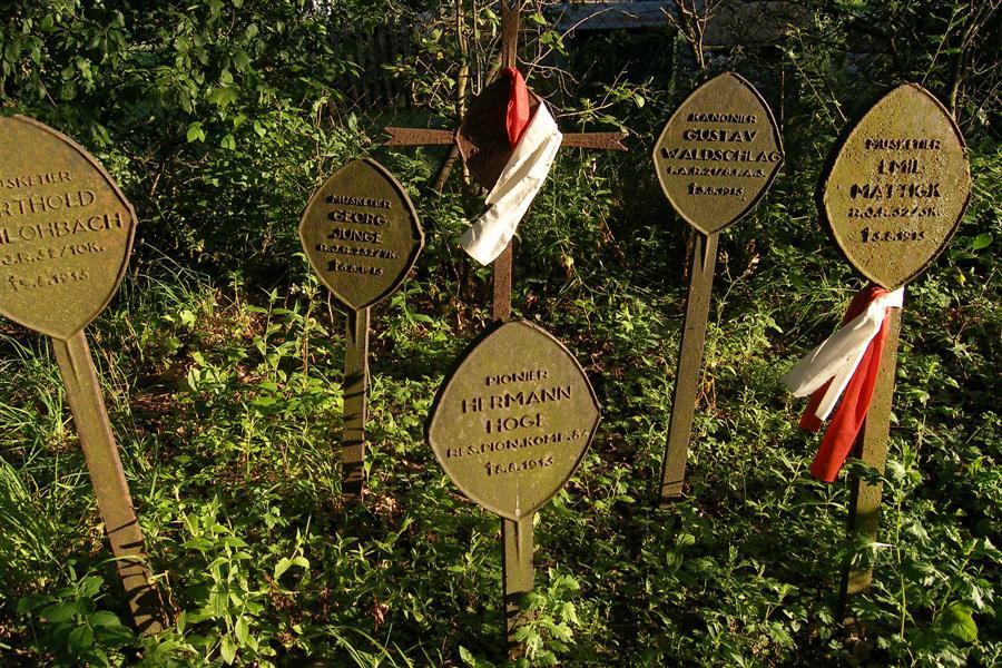 MUSKETIER BERTHOLD SCHLOHBACH, R. J. R. 52/10K., † 9.8.1915 PIONIER HERMANN HOGE, RES. PION. KOMP. 84, † 8.8.1915 MUSKETIER GEORG JUNGE, R. J. R. 232/7K., † 8.8.1915 MUSKETIER BOLESLAUS WISNIEWSKI, R. J. R. 267/1K., † 10.8.1915 KANONIER GUSTAV WALDSCHLAG, F. A. R. 21/8. F. A. 3, † 3.8.1915 MUSKETIER EMIL MATTIGK, R. J. R. 52/3K., † 3.8.1915 MUSKETIER KARL FORSTER, B. R. J. R. 13/1K., † 3.8.1915 UNTOFFZ. WALTER SOMMER, R. J. R. 267/3K., † 9.8.1915 ERS. RES. MICHAEL ARNOLD, R. J. R. 227/11K., † 8.8.1915 MUSKETIER ERNST BURZLAM, R. J. R. 52/12K., † 3.8.1915 MUSKETIER OTTO WELS, R. J. R. 227/11K., † 3.8.1915 UNTOFFZ. ANTON SCHALLER, B. R. J. R. 13/7K., † 2.8.1915 ERS. RES. ALBIN DÖLSCHNER, R. J. R. 227/10K., † 3.8.1915 MUSKETIER OTTO REBENTISCH, R. J. R. 52/9K., † 3.8.1915 RESERVIST HEINRICH KRUPP, R. J. R. 52/9K., † 4.8.1915 LDSTM. JOHANN JAKOB, B. R. J. R. 13/6K., † 2.8.1915 ERS. RES. KONRAD BRUNNER, B. R. J. R. 13/6K., † 2.8.1915 JNFANT. JOHANN KRELLER, BAYR. J. R. 22/7K., † 2.8.1915 GEFREITER MAX LEHRER, B. R. J. R. 13/7K., † 3.8.1915 GRENADIER KARL DINSE, STAB DER 81. R. D., † 7.8.1915