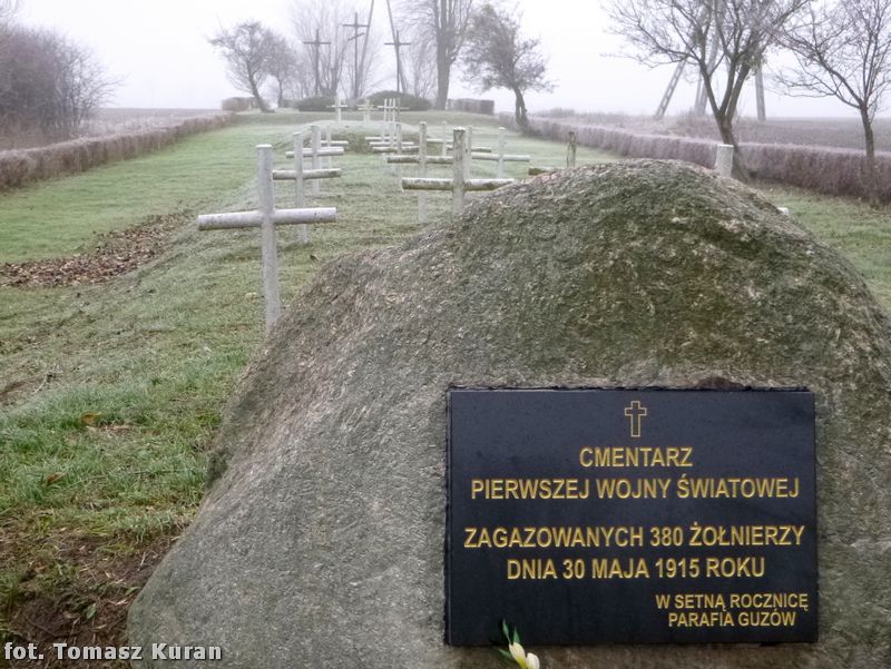"CMENTARZ • PIERWSZEJ WOJNY ŚWIATOWEJ •• ZAGAZOWANYCH 380 ŻOŁNIERZY • DNIA 30 MAJA 1915 ROKU •• W SETNĄ ROCZNICĘ • PARAFIA GUZÓW".