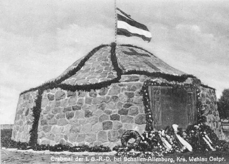 "ZUM BLEIBENDEM GEDACHT- • NIS AM DIE HIER RUHEN DEN • 134 ANGEHÖRIGEN DER 1. GAR- DE - RESERVE - DIVISION DIE • BEI OSTPREUSSENS BEFREUNG VON DEN RUS- • SEN VOR SCHALLEN AM • 9. SEPTEMBER 1914. FIELEN".