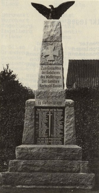 Uwieczniono w ten sposób nazwiska poległych podczas IWŚ mieszkańców wsi: Bażyny (parafia i obszar dworski Basien), Lejławki Wielkie (Groß-Grünheide) oraz Lejławki Małe (Klein-Grünheide). Zachowała się betonowa podstawa pomnika (obecnie na terenie prywatnym).