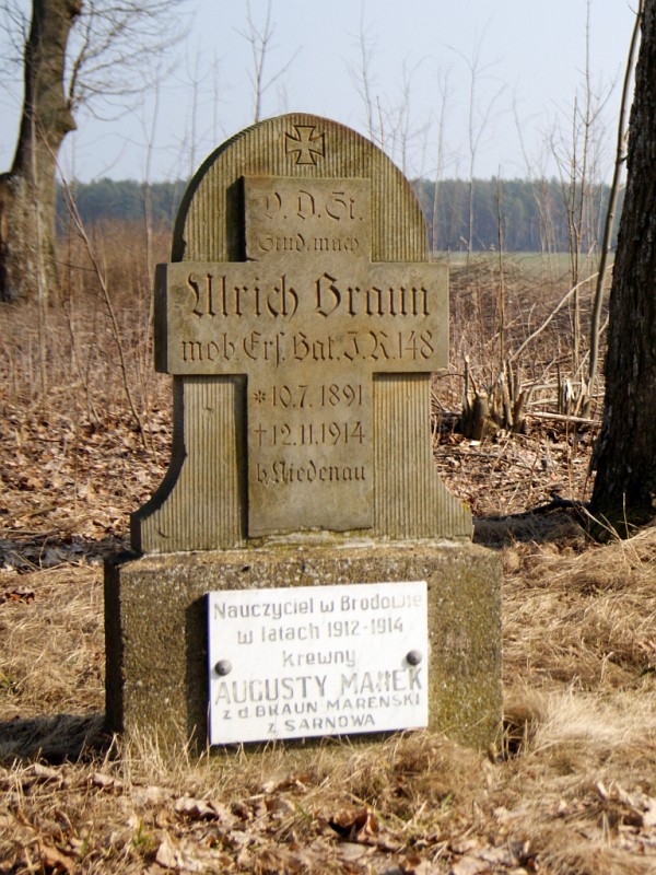 Do pomnika przymocowana tablica o treści: ”Nauczyciel w Brodowie • w latach 1912-1914 • krewny • AUGUSTYNY MAŁŁEK • z d. BRAUN MARENSKI • z SARNOWA”. Żołnierz poległ pod Niedanowem.