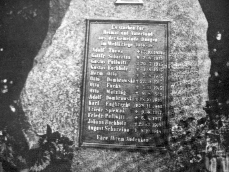 Es starben für Heimat und Vaterland aus der Gemeinde Dungen im Weltkriege 1914-18 Adolf Thews, † 15.10.1914 Gottfr. Schareina, † 2.4.1915 Gustav Pullwitt, † 20.7.1915 Gustav Buchholz, † 1.8.1915 Herm. Otto, † 7.8.1915 Otto Dombrowski, † 27.9.1915 Otto Fuchs, † 5.11.1915 Otto Mätzing, † 8.6.1916 Adolf Dombrowski, † 28.10.1916 Karl Engbrecht, † 28.11.1916 Friedr. Spiewak, † 9.4.1917 Friedr. Pullwitt, † 6.5.1917 Johann Buchholz, † 23.2.1918 August Schareina, † 8.10.1918 Ehre ihrem Andenken!