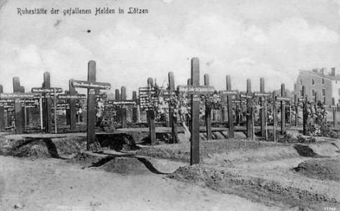 Leutnant August May, Inf. Regt. 147, † 12.12.14 Ers. Res. P. Waitka, Inf. Regt. 227, † 24.10.14 Wehrm. Wittich, Res. Art. Regt. 49, † 24.10.12 Musket. Sander, Inf. Regt. 225, † 24.10.12 Gfr. Burgmann, Res. Art. Regt. 49, † 24.10.12 Ers. Res. W. Margnes, Inf. Regt. 227, † 24.10.14 Kriegsfrw. W. George, Inf. Regt. 231, † 25.10.14 Fusil. Ad. Horstmann, Gren. Regt. 5, † 16.9.14 Grend. F. Gonschorreck, Gren. Regt. 4, † 16.9.14 Musk. Hermann Post, Inf. Regt. 176, † 17.9.14 Musk. B. Wischnowski, Inf. Regt. 128, † 12.9.14 Musk. B. Radziong, Inf. Regt. 129, † 16.9.14 Wehrm. Aug. Rumpelt, Inf. Regt. 33, † 16.9.14 Reserv. Waschkewitz, Inf. Regt. 128, † 12.9.14 Musk. Albert Grunherd, Inf. Regt. 44, † 18.9.14 Jäger Karl Buchholz, Jäg. Regt. zu Pf. 4, † 19.9.14 Inftr. G. Schmuschka, Russ. I. Regt. 170, † 19.9.14 Gefr. Sieder Banni, Russ. I. Regt. 302, † 16.9.14 Luftschiffer August Wilk, Luftschifferabt. 8, † 8.10.14 Maurermeister H. Brandenburg † 9.10.14 Armierungssoldat Julius Gerber, Fortifikation Lötzen, † 13.1.15 Beamt. St. Vertr. Karl Bornel, Garn. Lat. z. Lötzen, † ?.6.16 Pionier Fritz Gabriel, 6. Minenw. Batl. Arys, † 3.1.17 Kriegsinvalide Franz Foltin, † 2.9.17 Ok. Handw. Emil Sbrzesny, Bekl. Batl. Elbing, † 30.6.18 Walter Hering, Leutnant d. R. im Fussartl. Regt. Nr. 1 Ritter d. EK, * 15.10.1895 † 24.10.1918 Sergeant Rudolf Seneberg, Landst. Batl. Lötzen, † 21.12.18 Landsturmann Albert Schulz, 2. Komp. Arm. Batl. 108, † 25.10.18 Kanonier Wilhelm Bartschm, Ers. Batl. Fuszartl. Regt. 22, †23.7.18 Telegrafist Eugen Brumm, Festfernspr. Abt., † 16.1.19 Infantrist M. Sandiganow, Russ. Inf. Regt. 202, † 2.11.18 Schütze Grigori Vasilenko, Russ. Schützen Regt. 8, † 18.10.17 Infantrist Iw. Schmacionek, 5. Kaukas Etap. Batl., † 5.6.15 Infantrist Iwan Rosmkow, Russ. Inf. Regt. 171, † ??? Soldat ?? Serbin, Rumane, † 15.5.17 Infantrist Josef Cardelli, Ruman. Inf. Rgt. 41, † 29.3.17 Infantrist Aga Laidbatalow, zu Turkes Inf. Regt. 4, † 6.5.16 Belgier Lux Bauderie, † 13.9.17 Belgier Julius Debonte, † 22.2.17 Belgier Oskar Martinet, † 6.2.17 Garnisonpfarrer Gottfried Bienk Kriegsverletzter Willi Sokoll, Vers. Stell Lötzen, † ?6.1.20 Hilfswochim, Erlih Goy, Schutzpolizei Lötzen, 12.?.21 Oberschütze Ernst Chlensch, III. Inf. Regt. 2, † 2.6.22 Kanonier Paul Hennig, 5. Artl. Reg. Allenstein * 13.9.14, † 17.11.34