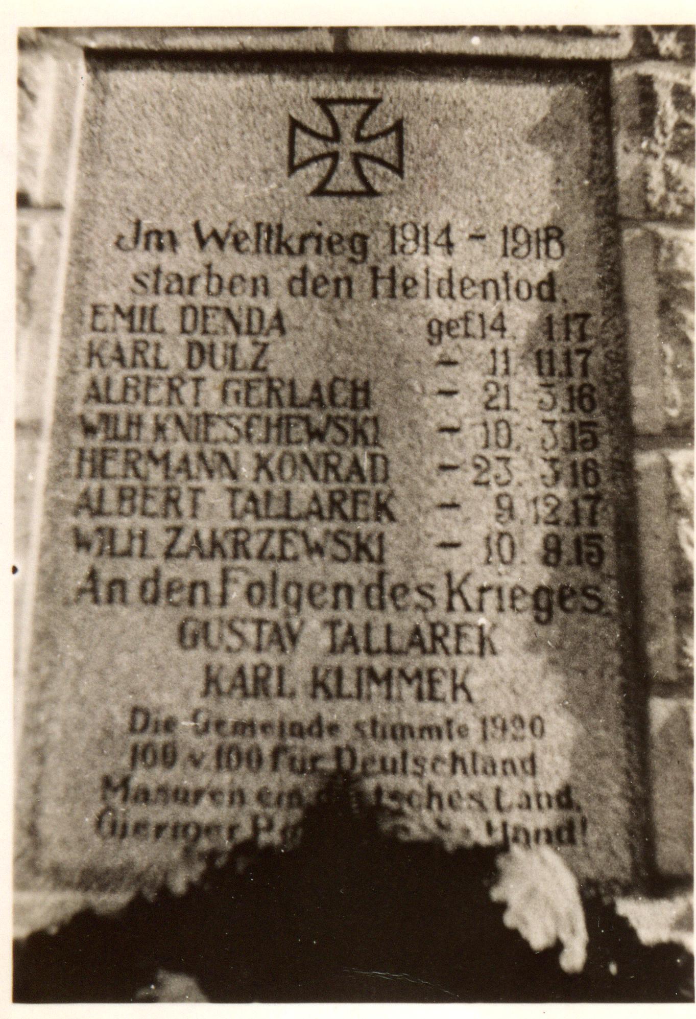 Pomnik upamiętniał jednocześnie mieszkańców wsi poległych w czasie I WŚ oraz wyniki plebiscytu z 1920 r.