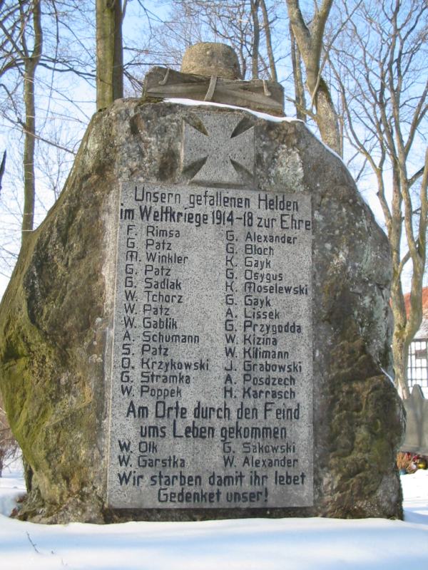 Unsern gefallenen Helden im Weltkriege 1914-18 zur Ehre F. Rimsa G. Patz M. Winkler G. Patz G. Sadlak W. Tchorz W. Patz W. Gablik A. Schumann S. Patz O. Krzykowski G. Stramka W. Poppek G. Alexander G. Bloch K. Gayk G. Osygus K. Moselewski G. Gayk A. Lissek G. Przygodda W. Kizina W. Kilimann J. Grabowski A. Posdzech H. Karrasch Am Orte durch den Feind ums Leben gekommen W. Olk W. Garstka G. Sakowski W. Alexander Wir starben damit ihr lebet Gedenket unser!