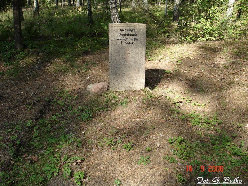 "Gedenkstein • für den, auf dem Felde der Ehre • in Russland bei Oleschno • gefallenen Bruder u. Schwager • Musk. Gustav Trinogga. • 2. Komp Inf. Regt. 151 • 11.4.1891 - 2.11.1914 • Fern, im fremden • Erden. • Dein Grab beschieden • Dier. • Doch die Deinigen • stets werden • - Kommen - • zum Gedenken hier."