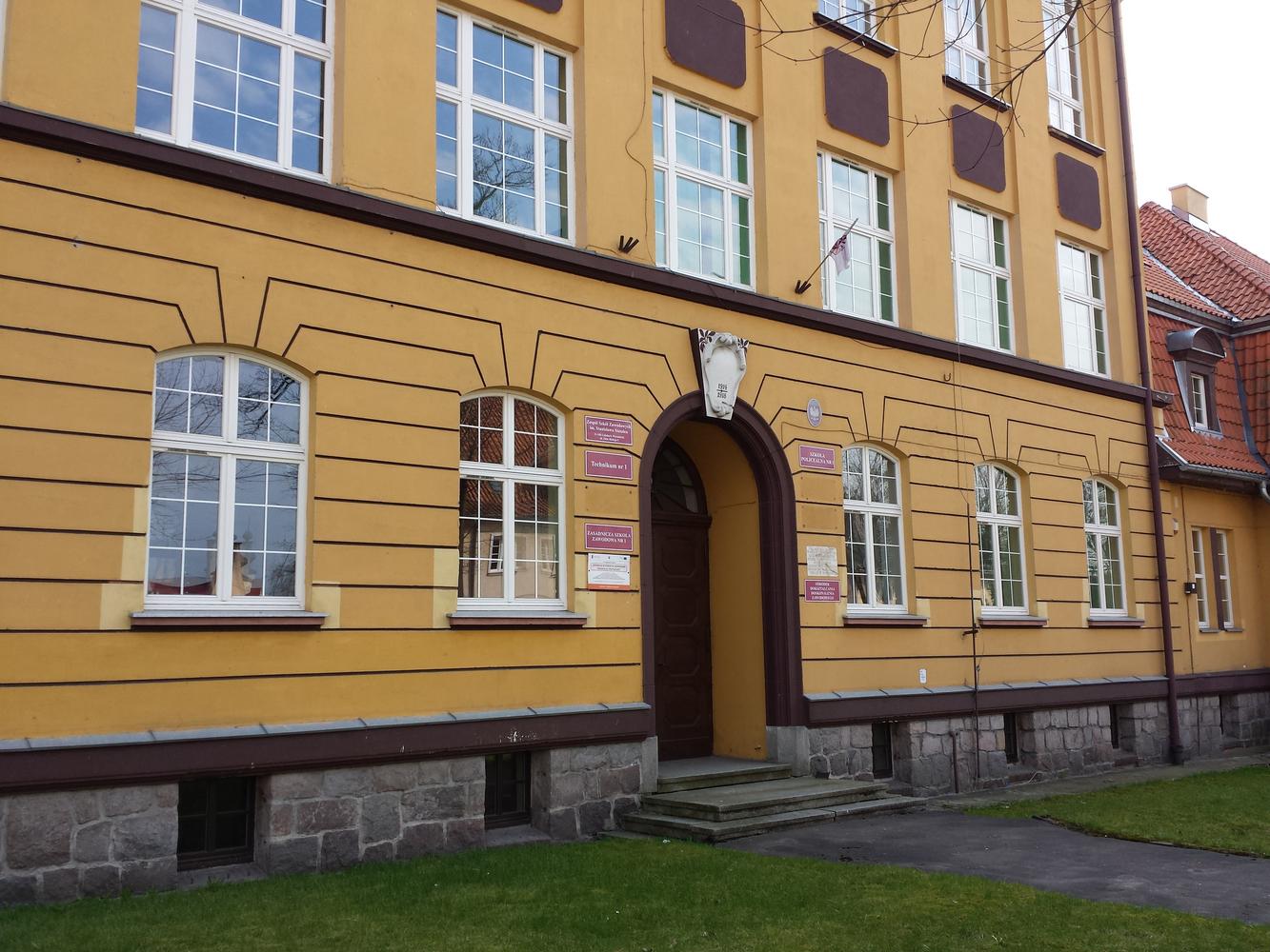 Znajduje się nad wejściem do budynku zespołu szkół zawodowych (przy ul. Orła Białego).