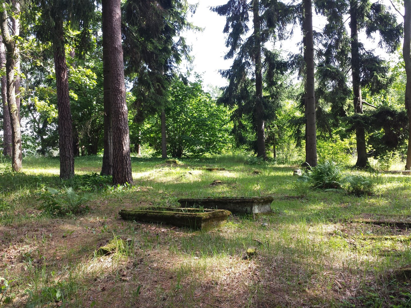 Zlokalizowane na dawnym cmentarzu ewangelickim (do 1945 roku podlegał pod nieistniejącą obecnie miejscowość Róg - niem. Roggen), w jego północnej części. Spoczywa tu 1 żołnierz armii niemieckiej oraz 1 nieznany żołnierz armii rosyjskiej z 303 pułku piechoty. Na mogiłach krzyż ze sztucznego kamienia i betonowy nagrobek pulpitowy. Brak obramienia mogił. Stan zachowania dobry.
