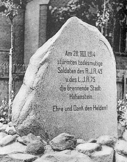 "Am 28 VIII 1914 • stürmten todesmutige • Soldaten des R.J.R. 49 • u. des L.J.R. 75 • die brennende Stadt • Hohenstein • Ehre und Dank den Helden!".1)