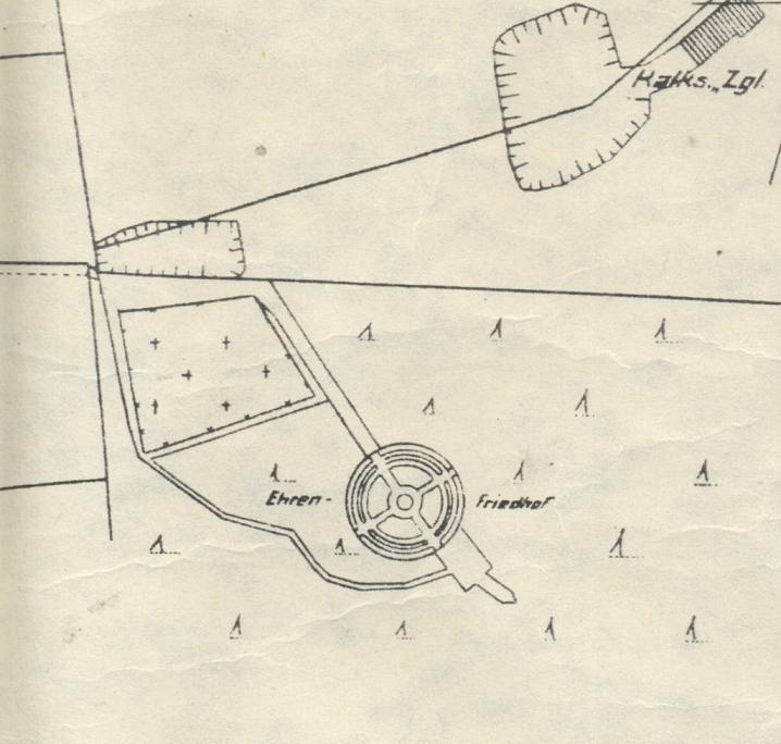 Pochowanych jest tu 254 żołnierzy armii niemieckiej, głównie zmarłych z ran w latach 1914-1918, 24 weteranów zmarłych na początku lat dwudziestych, 5 żołnierzy armii rosyjskiej i 1 żołnierz rumuński. Cmentarz zachowany w stanie szczątkowym, z dawnego założenia zachował się krzyż i częściowo drzewostan. Układ mogił całkowicie zniszczony.