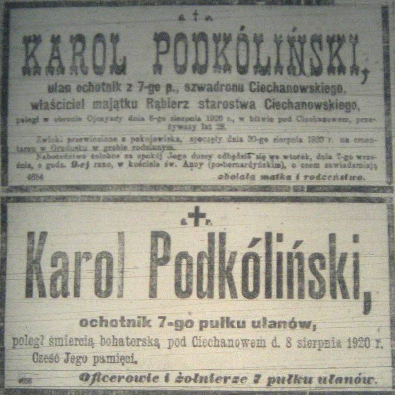 Karol Podkóliński, ochotnik, ułan, 7 p.uł., pol. 08.08.1920 pod Ciechanowem