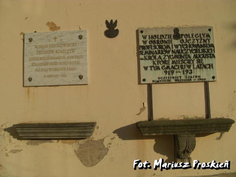 Umieszczone na ścianie dawnego seminarium nauczycielskiego im. Króla Zygmunta Augusta (ul. A.Mickiewicza 2A), od strony pałacu Branickich.