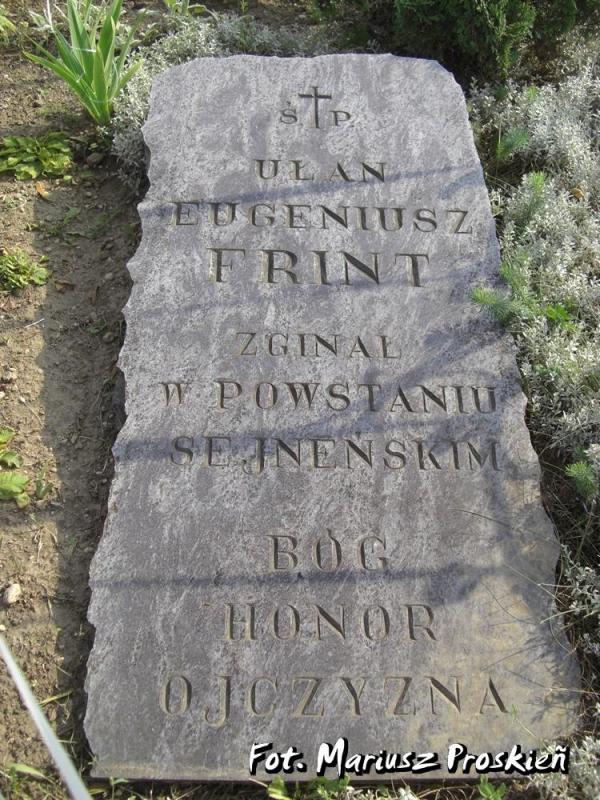 "Ś. † P. • UŁAN • EUGENIUSZ • FRINT • ZGINĄŁ • W POWSTANIU • SEJNEŃSKIM •• BÓG • HONOR • OJCZYZNA".