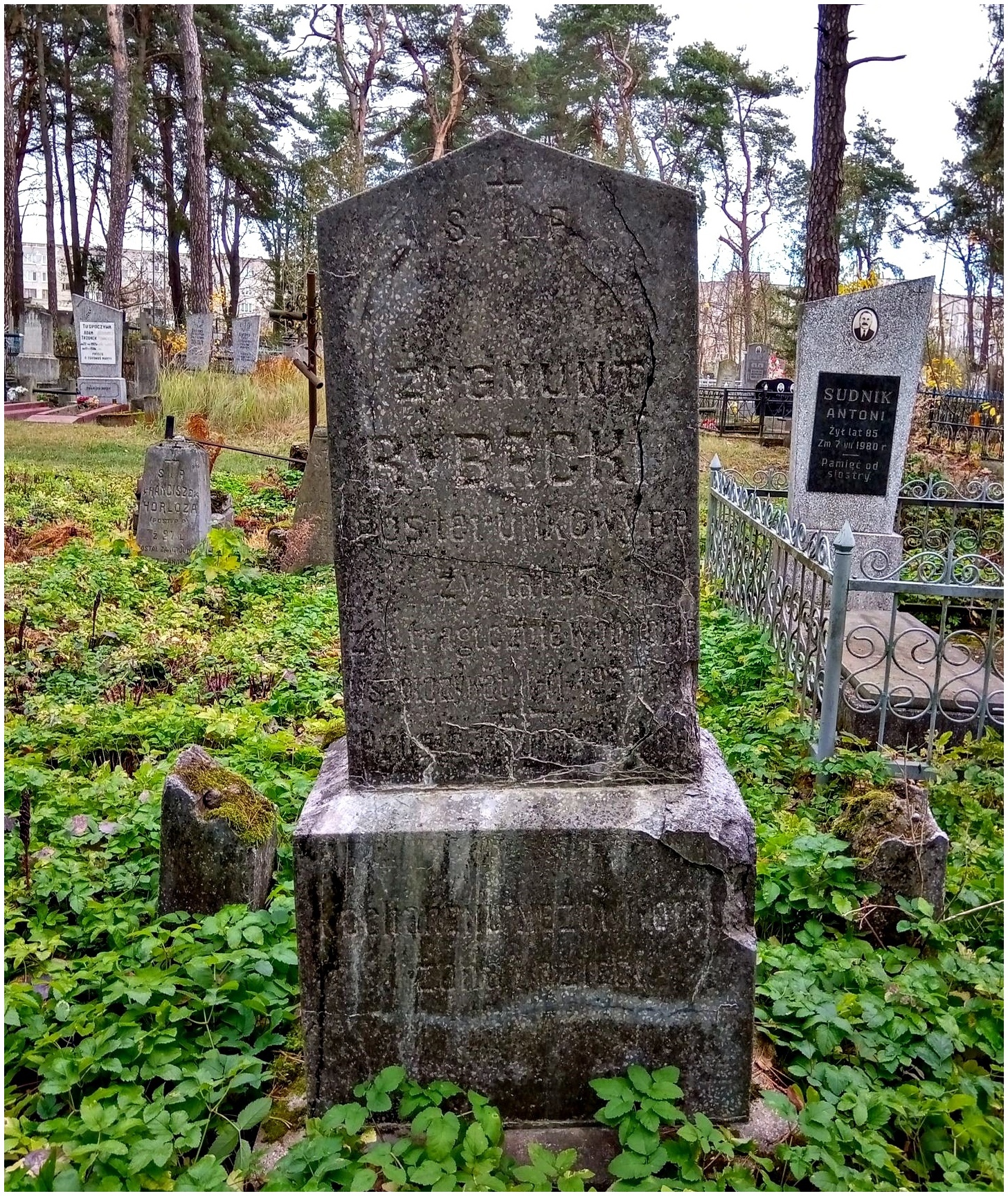 ,,Ś. † P. ADAM GRUDZIŃSKI / KANCELISTA / INSP. SANITARNY / N.N.K. / UMARŁ 9 LUTEGO 1923 R. / CZEŚĆ JEGO PAMIĘCI"