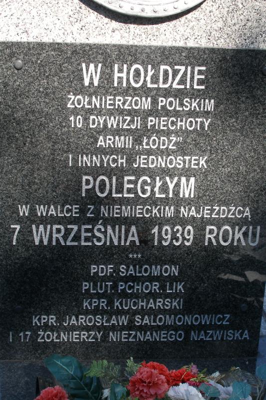 "W HOŁDZIE • ŻOŁNIERZOM POLSKIM • 10 DYWIZJI PIECHOTY • ARMII "ŁÓDŹ" • I INNYCH JEDNOSTEK • POLEGŁYM • W WALCE Z NIEMIECKIM NAJEŹDŹCĄ • 7 WRZEŚNIA 1939 ROKU".