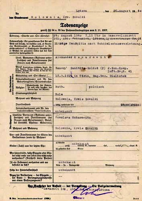 Infantrist Ed. Tuchkewitsch [Edward Tyszkiewicz] Bialystock, Pole, † 15.9.39 unbekannter Pole, † 17.9.39 Ed. Jankowski [Edmund Jankowski], Pole, † 26.9.39 Infantrist Thed. Aschewski [Teodor Aschlewski], Pole, † 28.9.39 Josef Woskowski [Józef Waśkowski], Pole, † 27.1.40 San. Soldat Alex Makarewitz [Aleksander Makarewicz], Pole, San. Komp. Inf. Rgt. 41, † 26.8.40 (VII, 348)